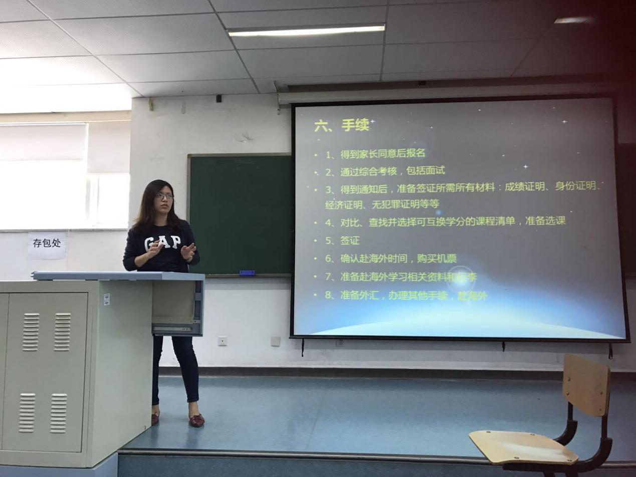 随后,郭媛媛说明了参与合作项目的基本原则,要求有意参加国际交流合作项目的大一同学,早点做好英语雅思考试等方面的准备,强调应具备“不打无准备之仗,有准备才能抓住到来的机会”的意识。陈晓彤则为同学们介绍了学校推进国际交流合作项目的基本政策,以及在准备出国交流、交换学习时需要办理的手续及注意事项。最后,对马上就要开展的新泽西城市大学项目,郭媛媛进行了详细说明。