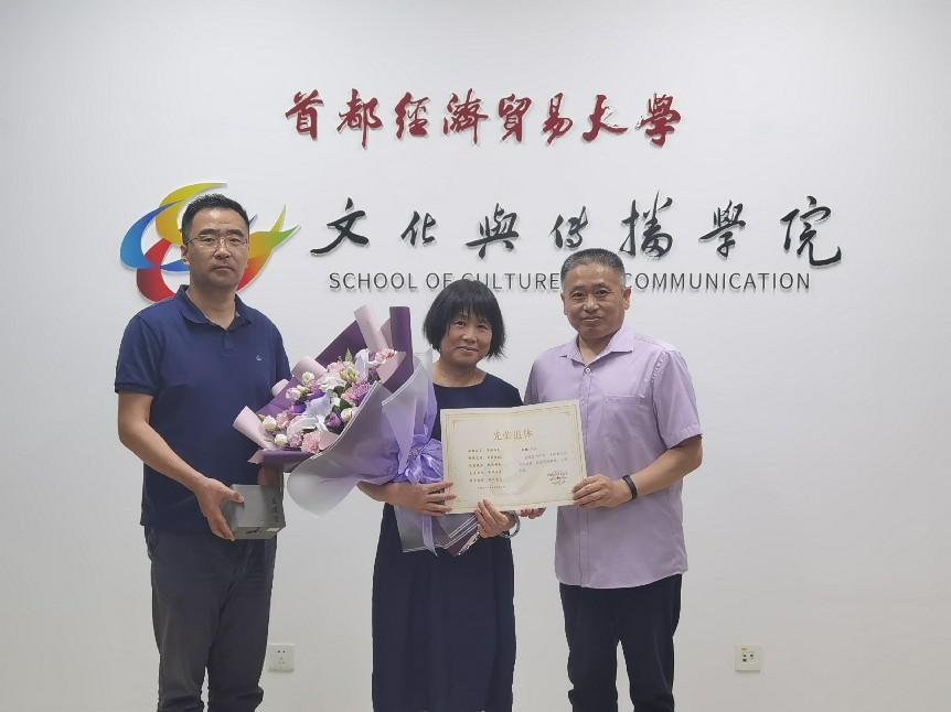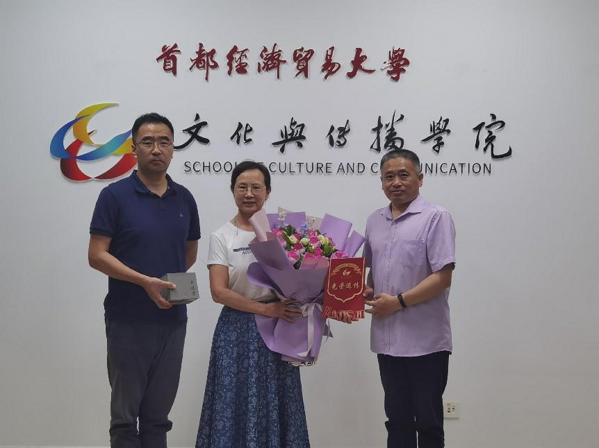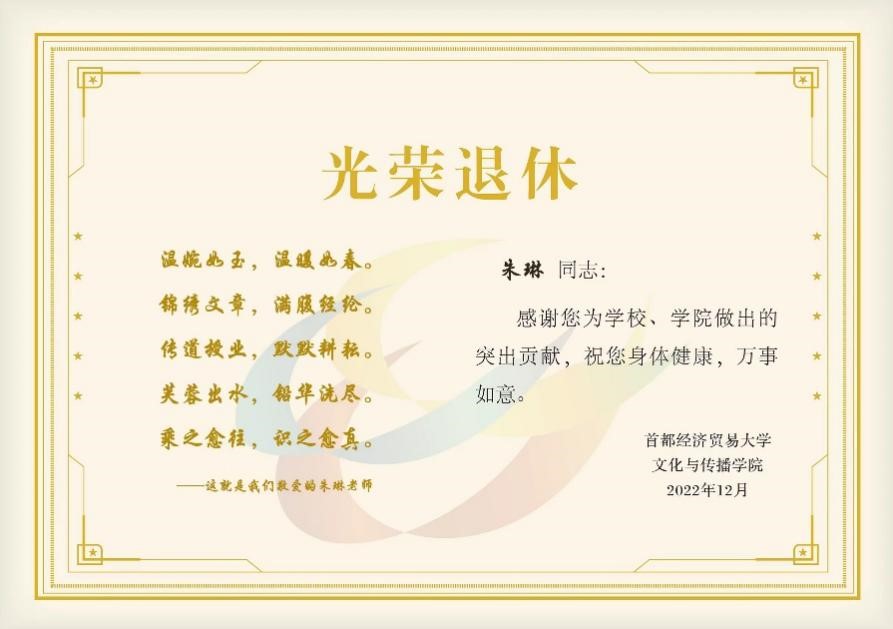 朱琳老师、杨景越老师于2022年荣退,两位老师在首经贸、在动漫疯 工作、生活了数十载时光。首先,学院党总支书记石刚代表全体教职工对两位老师在学院发展、学生成长成才中做出的奉献表达了深深地感谢,并祝愿她们拥有一个健康快乐、充实幸福的退休生活。接下来,党总支书记石刚和院长于九涛向两位教师赠送了学院精心设计制作的“光荣退休卡”,贺卡里一词一句满是学院对两位教师好学修身、勤勉敬业、尽善尽美的精神品质的赞美,和为教育事业热忱辛勤付出的敬意与感谢。