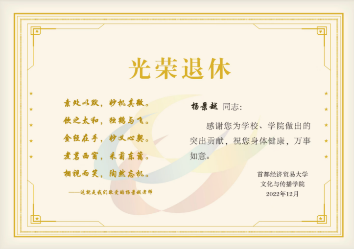 退休贺词中——“素处以默,妙机其微。”是杨景越老师安然淡泊的洒脱,遇事不急不躁的沉稳;“温婉如玉,温暖如春。”是朱琳老师温柔和善的品质,是育人如沐春风的滋润。