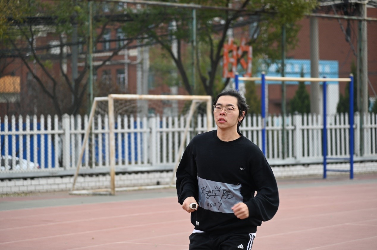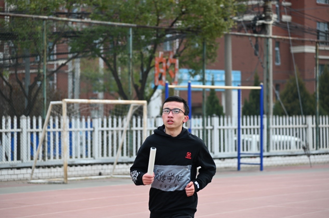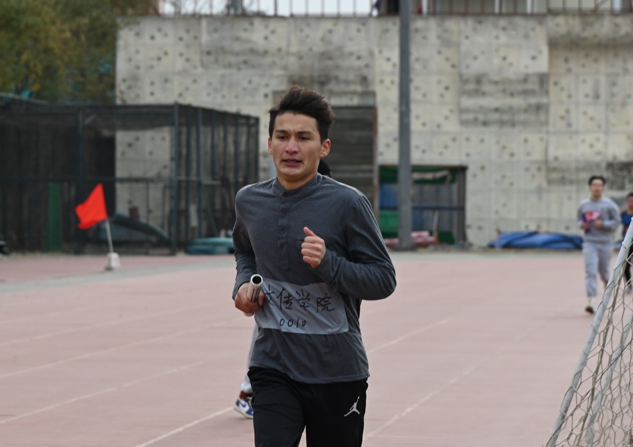 随后是由高洪轩、潘腾、阿布拉江、彭希、冯文强组成的男子接力赛。他们要跑的圈数比女生组要多一圈,多一圈难度就增加了数倍,但他们仿佛不知疲倦一般奋力直追,不断缩小着与前面同学的距离,努力拼搏,只为给文传增光添彩!