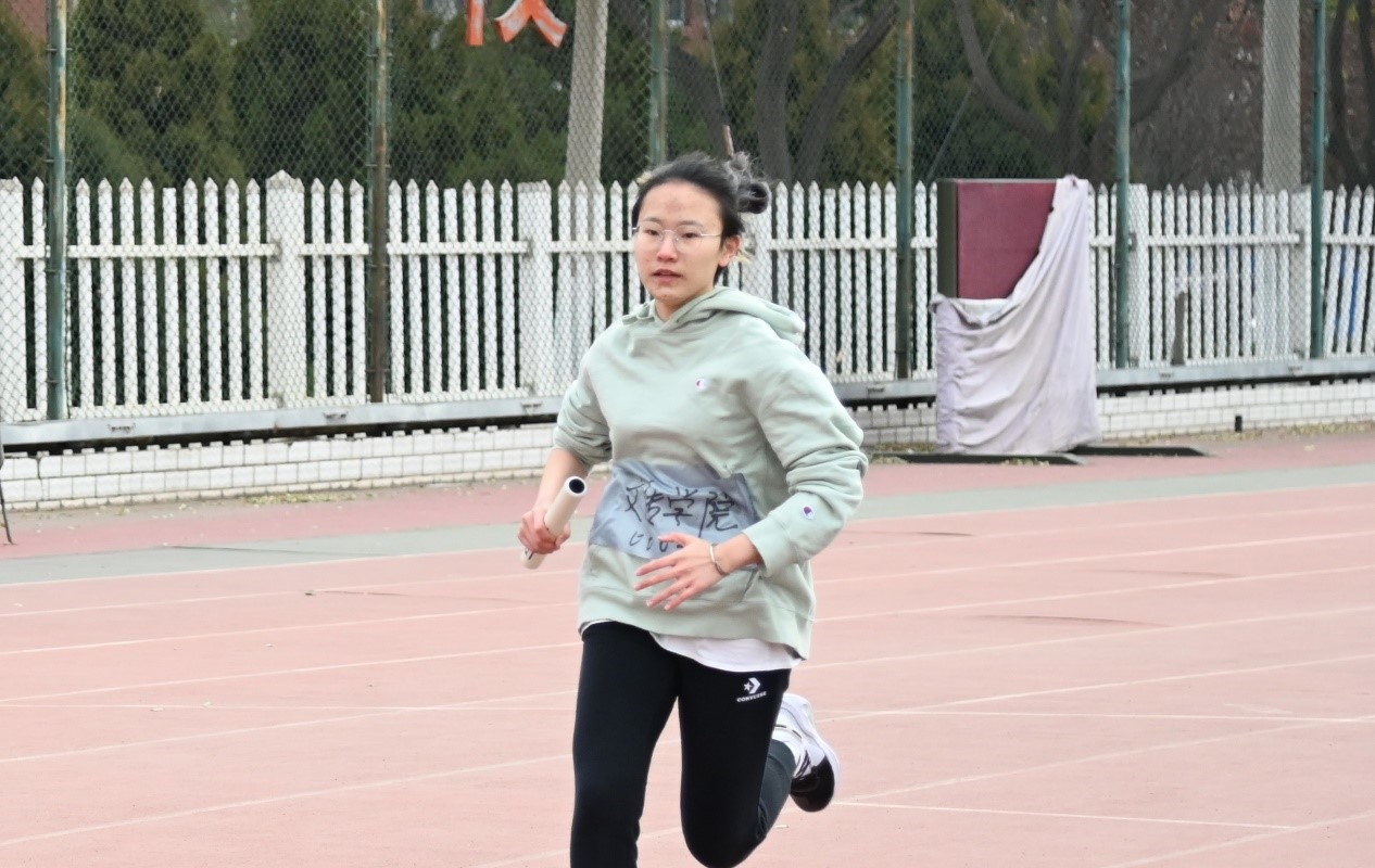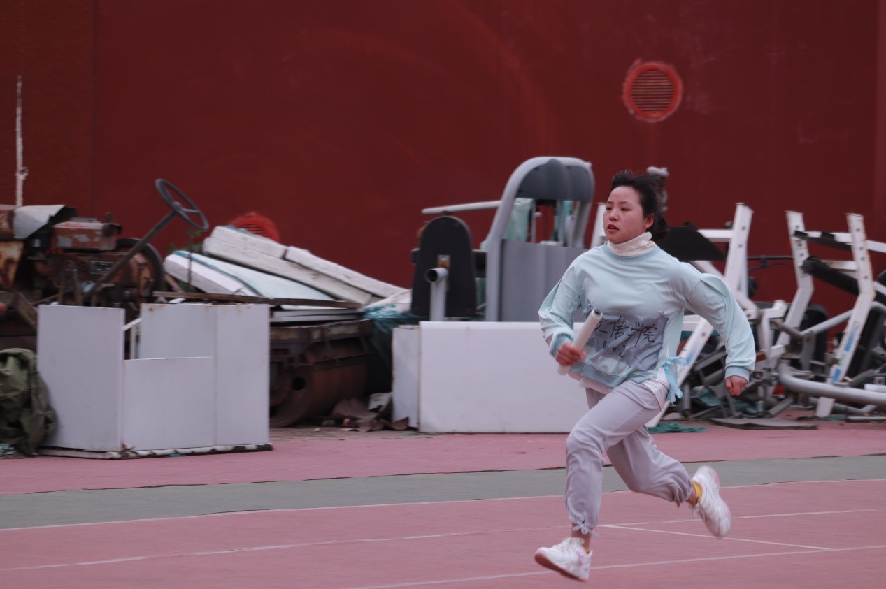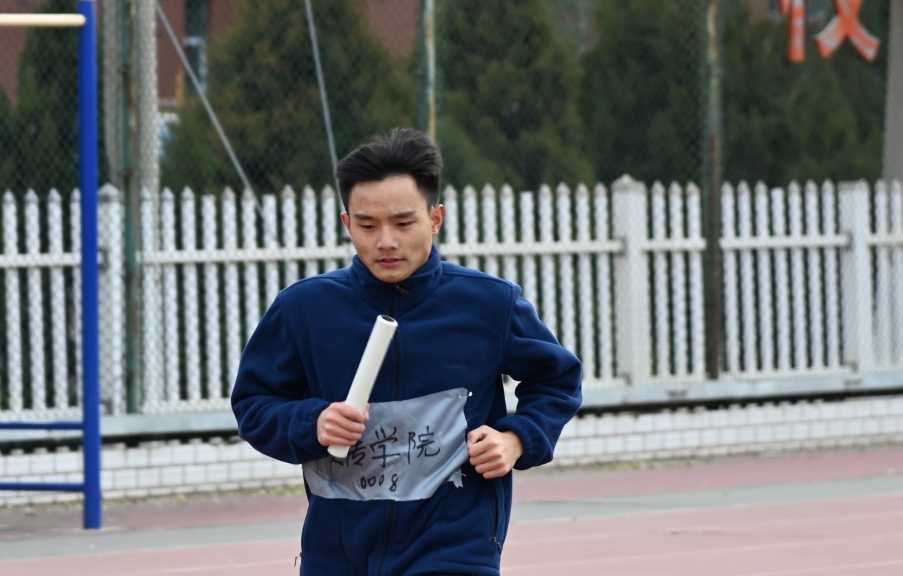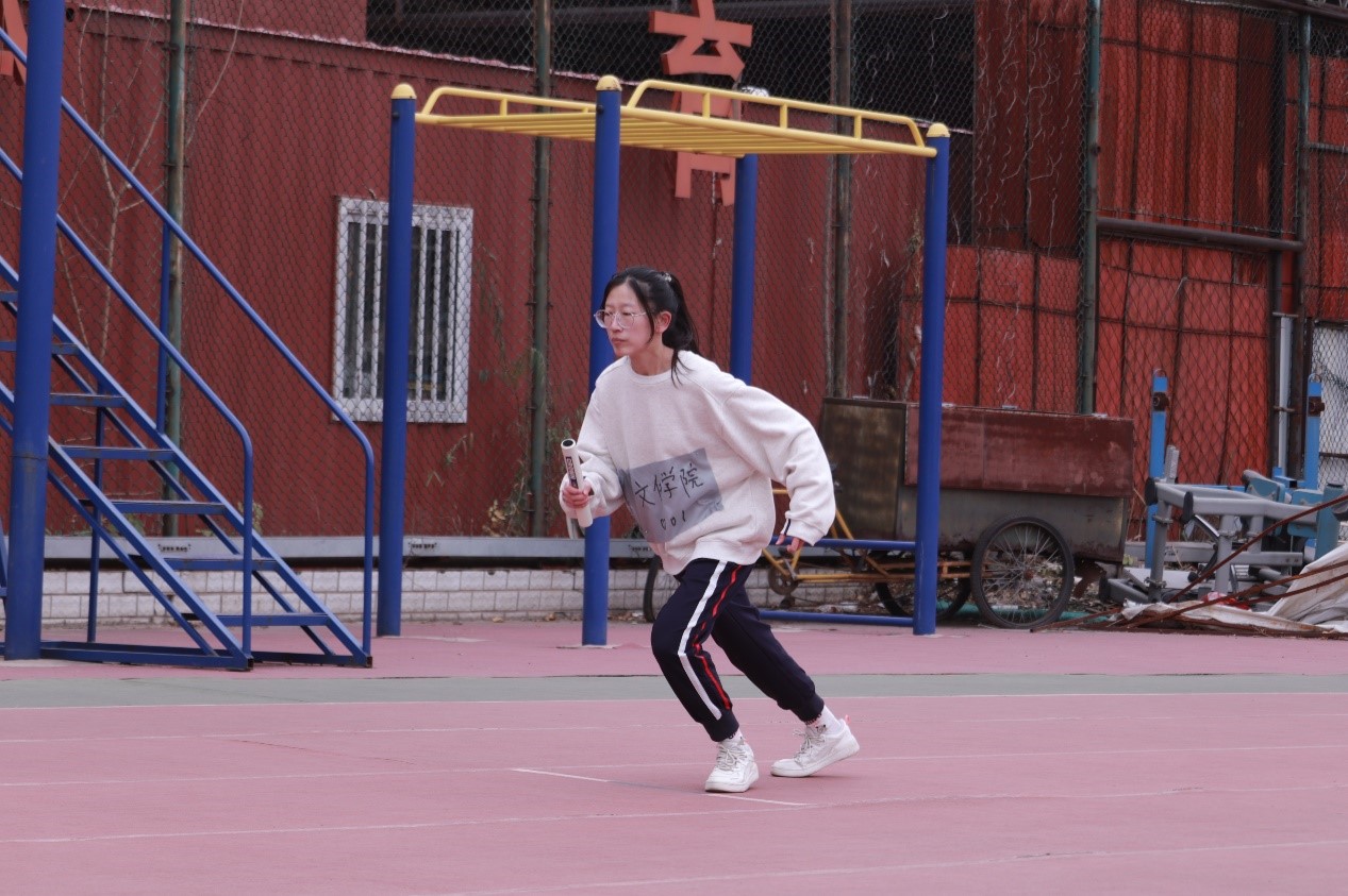 随后是由高洪轩、潘腾、阿布拉江、彭希、冯文强组成的男子接力赛。他们要跑的圈数比女生组要多一圈,多一圈难度就增加了数倍,但他们仿佛不知疲倦一般奋力直追,不断缩小着与前面同学的距离,努力拼搏,只为给文传增光添彩!