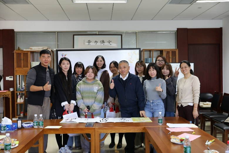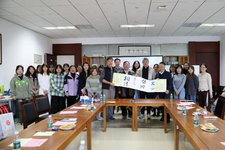 学院领导与校友代表共同完成了寄语作品。石刚与1987级、2002级、2011级的三位校友代表共同用毛笔题下“文心依旧 薪火相传”八个字,苍劲有力的笔墨彰显了学院精神的传承初心。