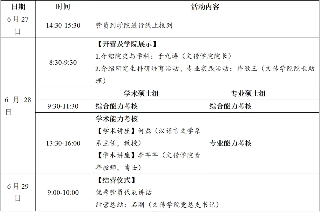 1.综合能力考核。(1)自我介绍:营员介绍自己参与的科研创新工作、未来学业规划。(2)专业实践:领取专业实践任务并进行讨论分析,考核营员的基本素质、专业理论能力。