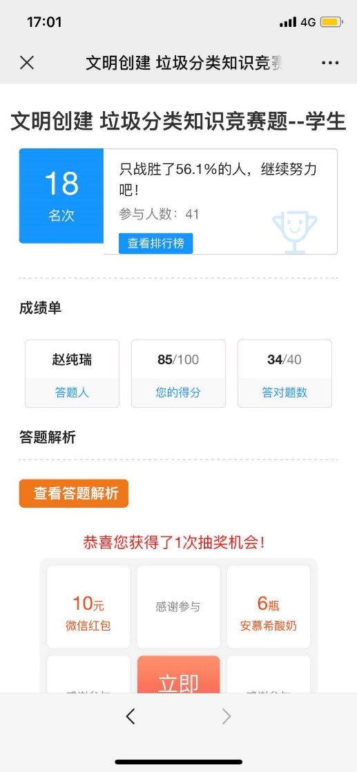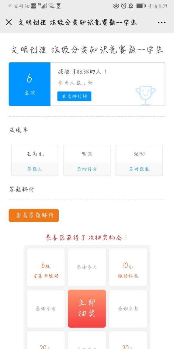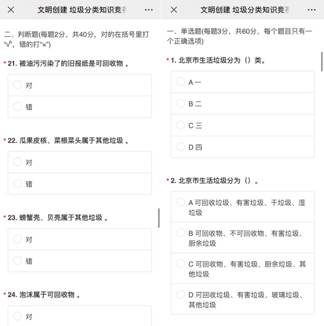 5月23日,动漫疯 党总支分享了有关垃圾分类知识的竞赛题目40道,本科生党员们答题热情高涨,纷纷转发答题并在微信群里互动讨论,上网搜索学习各种垃圾分属哪一类,还对照着小区橱窗内的宣传海报进行了深入了解。垃圾分类竞赛活动增强了大家对垃圾分类知识的了解,让“绿色、低碳、环保”的理念深入人心。本科生第一党支部党员刘琳说:“通过填写垃圾分类知识竞赛题,深深感受到自己在垃圾分类方面的知识还欠缺得很多,还有很多题目不确定甚至答错,这说明在平时还应该多多关注北京市垃圾分类相关规定,通过多种形式了解垃圾分类标准,锻炼提升自己垃圾分类的能力,起好党员的先锋模范带头作用,真正践行垃圾分类,党员先行!”