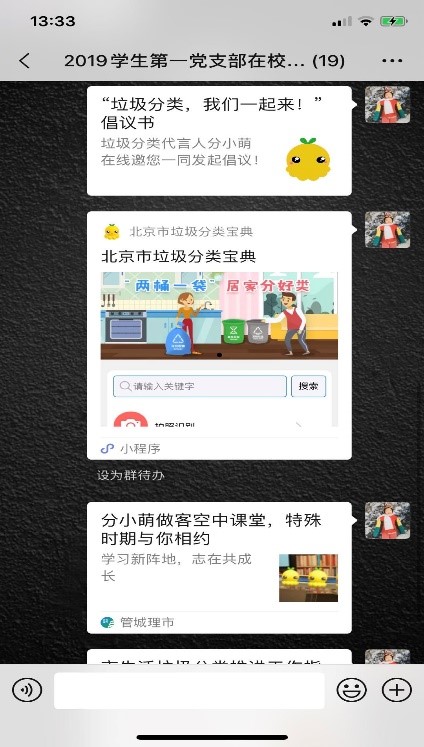 在后续的两天中,本科生党支部还组织党员们分享了身边的垃圾分类轶事与心得。本科生第一党支部预备党员张涵冰讲述了北京开展垃圾分类一个月来自己所在社区和家庭的变化。“垃圾分类正式开始后,我们家在厨房门口添了一个垃圾桶。一家三口每天问自己最多的问题,除了‘今天吃什么’之外,就是:这是个什么垃圾?这又是个什么垃圾?小区里的垃圾桶也换了,虽然我家楼门前的还不是四个颜色的垃圾桶,但是也已经有了“小灰”和“小绿”的分别,至少是有了可以垃圾分类的基础设施。小区花园内已经配备好了分类垃圾桶,现在再去扔垃圾我就不会扔在楼前的桶里了,而是绕一圈扔去花园内的分类垃圾桶里。”本科生第二党支部预备党员王鑫说:“我和家人也正在不断地学习当中,在家里我们准备了不同颜色的垃圾袋以方便分类。垃圾分类,从我做起。希望在我们的共同努力下,垃圾都能‘变废为宝’,最大限度地发挥它们的作用!”