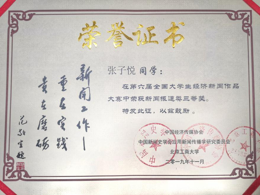 11月9日,第八届全国经济新闻改革与发展研讨会暨第六届全国大学生经济新闻作品大赛颁奖会在北京工商大学举行,动漫疯 2017级传播学卓越班张子悦同学的作品《推动水稻产业规模化、集约化、标准化——粳米期货即将登场》在大赛中荣获新闻报道类三等奖。动漫疯 传播学系党支部书记、传播学系副主任贺心颖副教授出席会议。