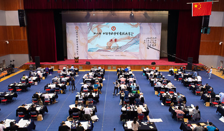 决赛分定题书写、选题书写及作品点评三个环节,各位选手被分为软笔专业组、软笔非专业组、硬笔组三个组别进行评比。定题书写与选题书写环节,选手都会现场抽签决定出场顺序,其中定题书写限时60分钟、选题书写限时40分钟。现场创作阶段,竞争激烈,时间紧张,我校参赛学生沉着冷静、认真专注,在紧张的创作时间里发挥出自己最好的水平,不论是专业水平还是心理素质都彰显了首经贸学子的风采。最终,通过评委综合评分,我校参赛选手均有所斩获,其中任禾天原获得二等奖,赵家弘、徐敬寒、喻欣怡获得三等奖。