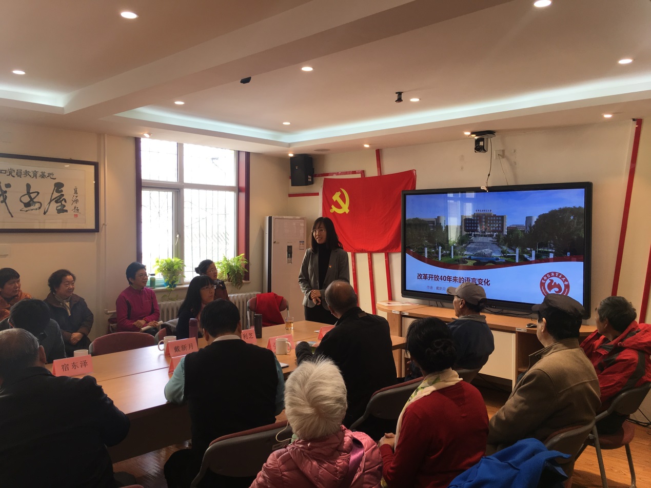上午10点钟交流准时开始。首先,戴新月老师以改革开放40年来的语言变化为主题,包含了语言变化的表现,特点和原因三个方面。清晰明了地展现了语言在改革开放中的变化,赢得了听众的认可和掌声。