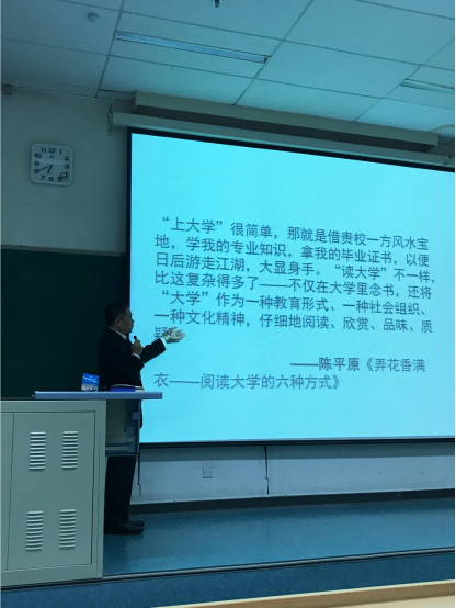 10月25日晚上在博学楼第十阶梯教室,动漫疯 石刚走进新生晚自习,与学院全体2017级新生一起分享了主题为“大学应该怎么读”的读书讲座。