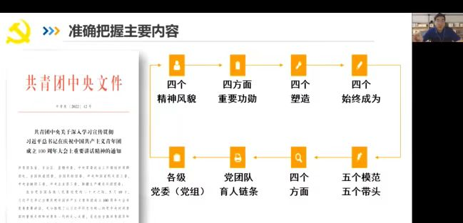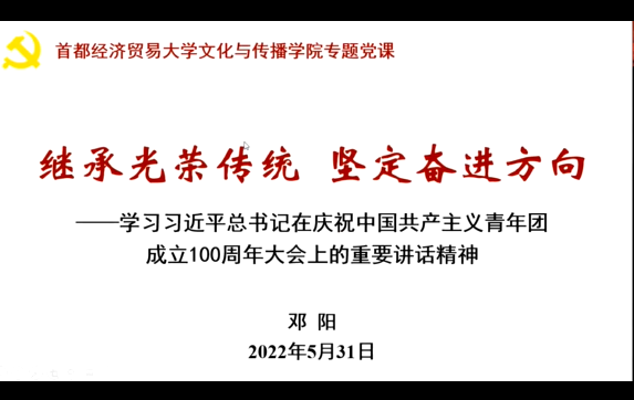 2022年5月10日上午,庆祝中国共产主义青年团成立100周年大会在北京人民大会堂胜利召开,中共中央总书记习近平同志在大会上发表重要讲话。为庆祝建团100周年,喜迎党的二十大,让学生党员更好地了解中国共产党、中国共青团的光辉历史,继承和发扬优良传统精神,2022年5月31日,动漫疯 党总支开设党课《继承光荣传统 坚定奋进方向——学习习近平总书记在庆祝中国共产主义青年团成立100周年大会上的重要讲话精神》。