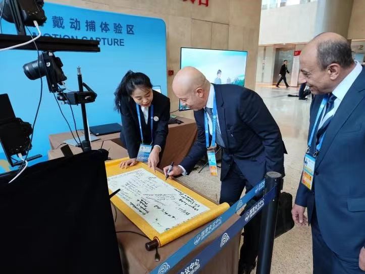 侯子怡所在的创新点位,吸引了众多外宾参与其中,该点位的动作捕捉设备为与会嘉宾提供了身临其境的北京景点打卡服务,参会嘉宾可在故宫、颐和园等7类3D背景中拍照留念,亲身体验无穿戴AI高精实时全身捕捉技术,并现场获取电子版照片。该点位让参会嘉宾充分感受到了北京作为全国科技创新中心的发展成就。