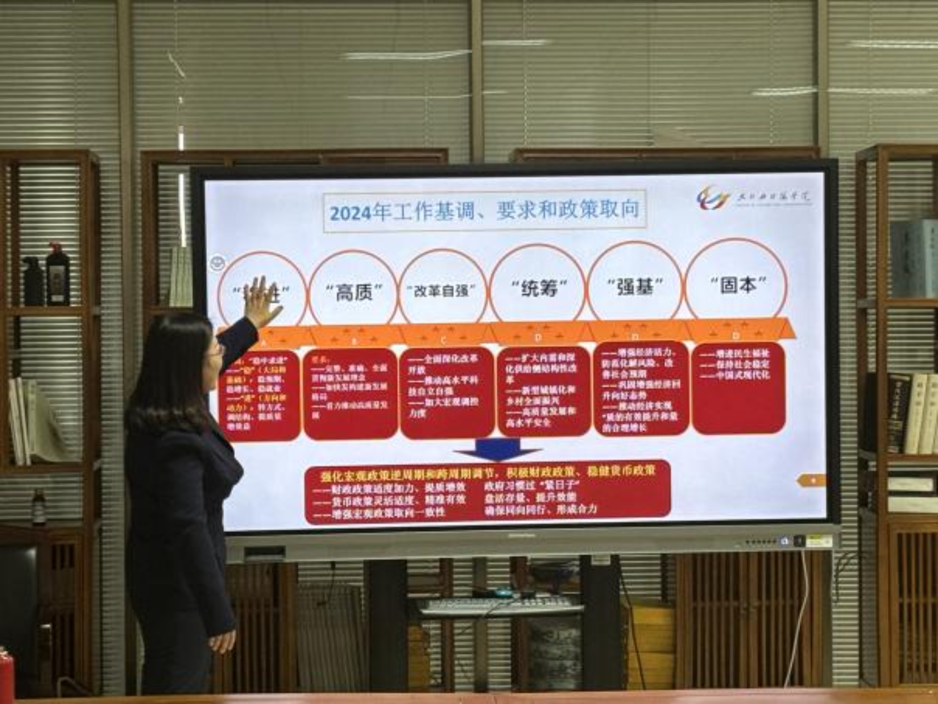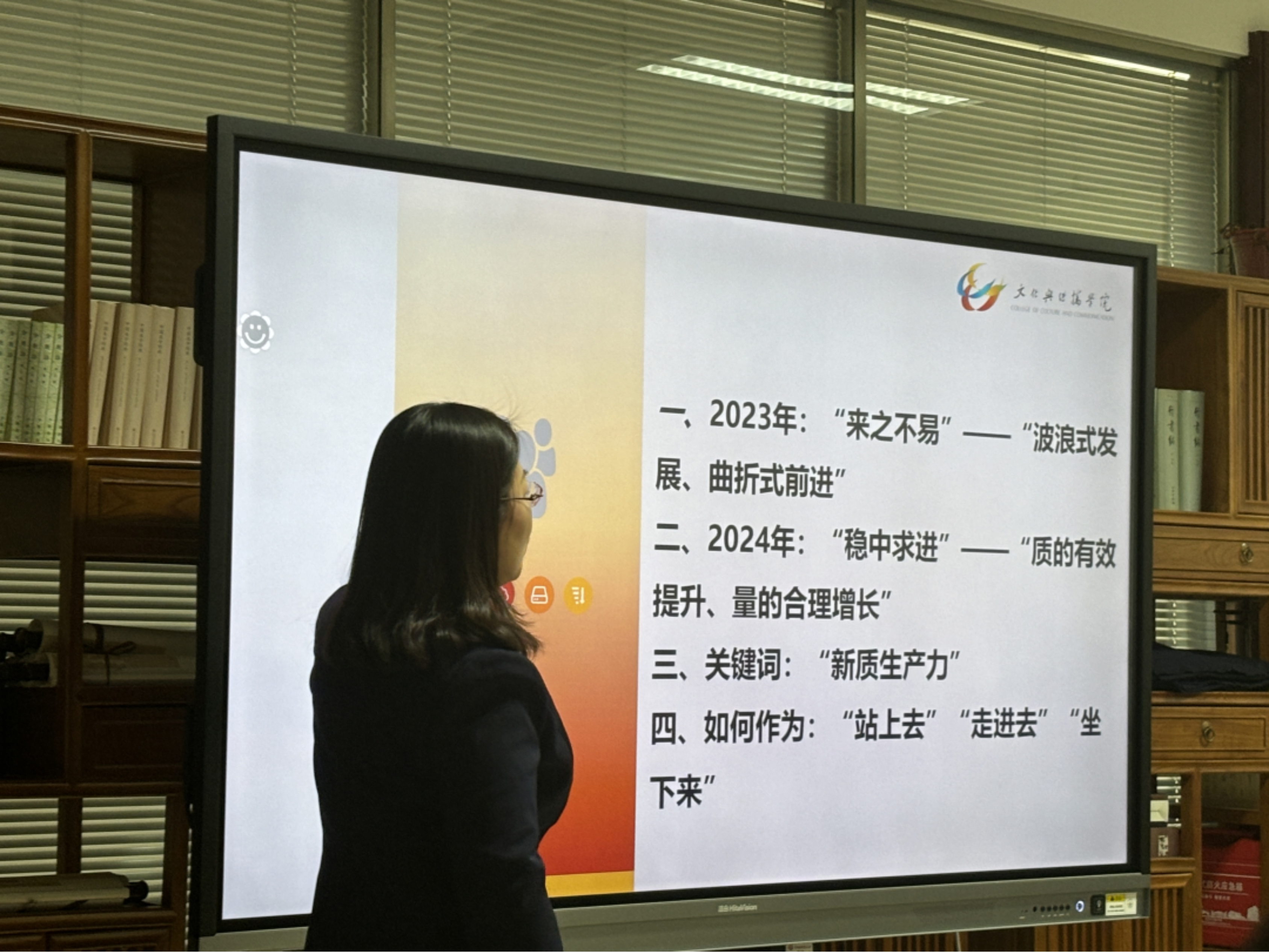以“2023年:‘来之不易’——‘波浪式发展、曲折式前进’”、“2024:‘稳中求进’——‘质的有效提升、量的合理增长’”、“关键词:‘新质生产力’”、“如何作为:‘站上去’、‘走进去’、‘坐下来’”四个部分,郭媛媛分享对今年两会精神的体会与认识。