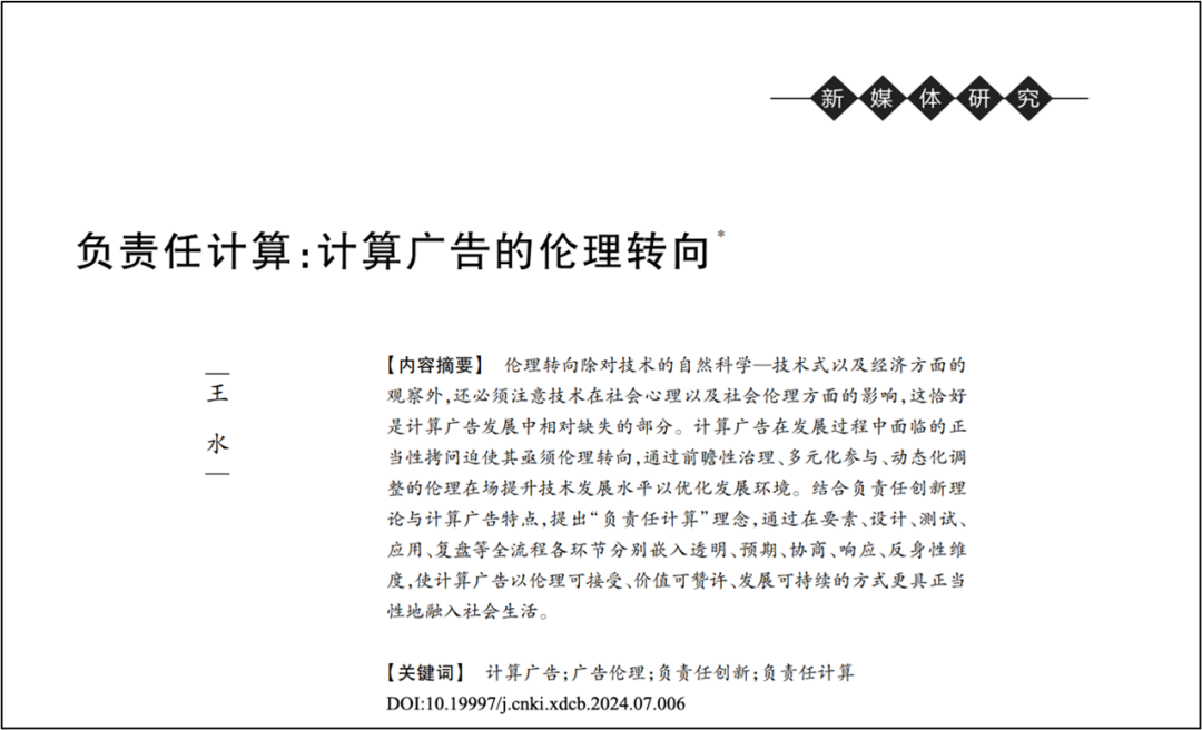 伦理转向指除对技术的自然科学—技术式以及经济方面的观察外,还必须注意技术在社会心理以及社会伦理方面的影响,这恰好是计算广告发展中相对缺失的部分。计算广告在发展过程中过度偏重工具理性和绩效导向,导致其面临来自政府与社会的正当性拷问,这一趋势迫使其亟须伦理转向,即通过前瞻性治理、多元化参与、动态化调整的伦理在场提升技术发展水平以优化发展环境。结合负责任创新理论与计算广告特点,本论文提出“负责任计算”理念,通过在要素、设计、测试、应用、复盘等全流程各环节分别嵌入透明、预期、协商、响应、反身性维度,推动计算广告以伦理可接受、价值可赞许、发展可持续的方式更具正当性地融入社会生活,为计算广告长期、健康、可持续发展夯实根基。