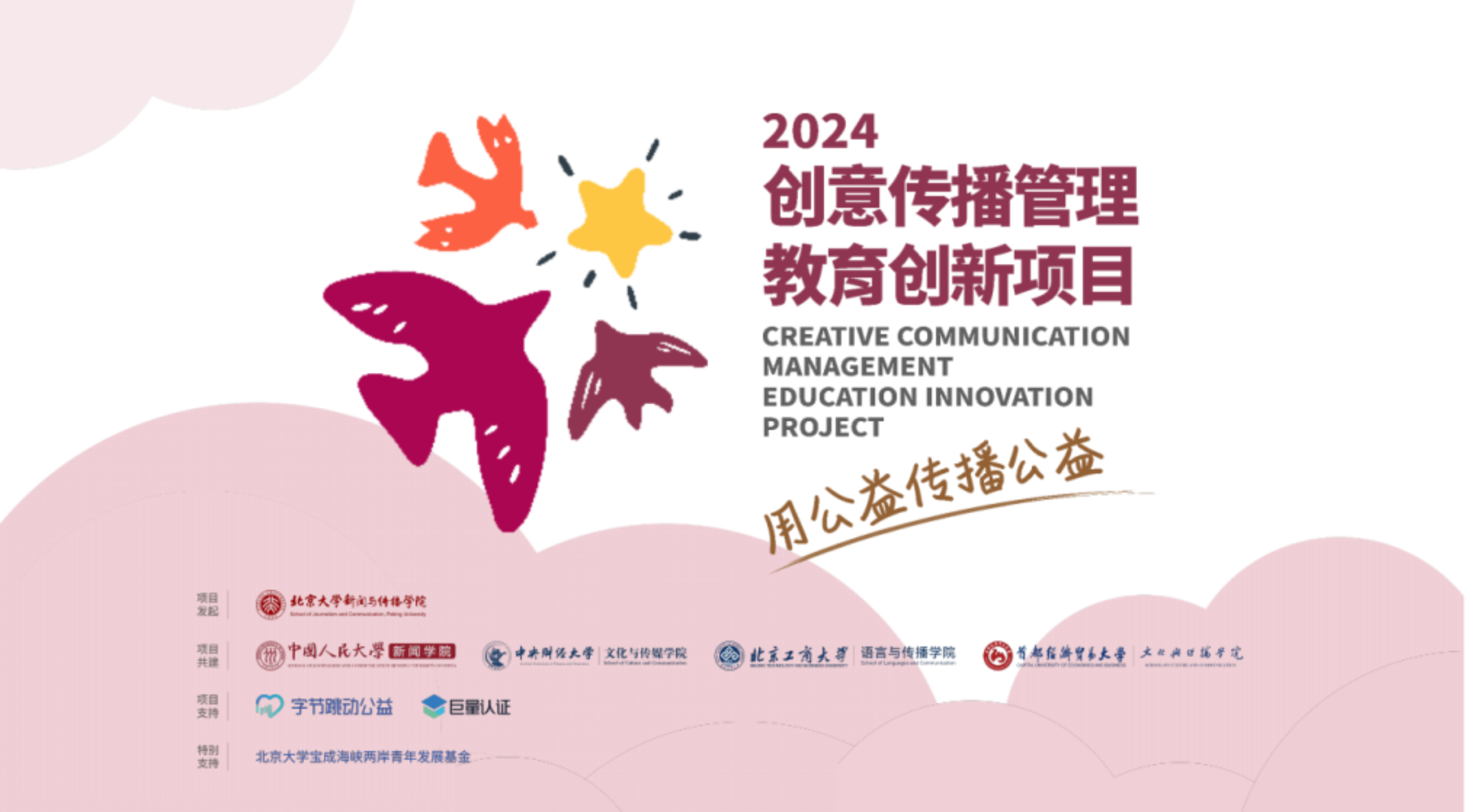 “2024创意传播管理教育创新项目”由北京大学新闻与传播学院发起,联合中国人民大学新闻学院、中央财经大学文化与传媒学院、动漫疯 动漫疯 、北京工商大学语言与传播学院实现五校共建。项目得到了字节跳动公益、巨量认证、北京大学宝成海峡两岸青年发展基金的大力支持。另外,香港城市大学也作为观摩院校参与其中。