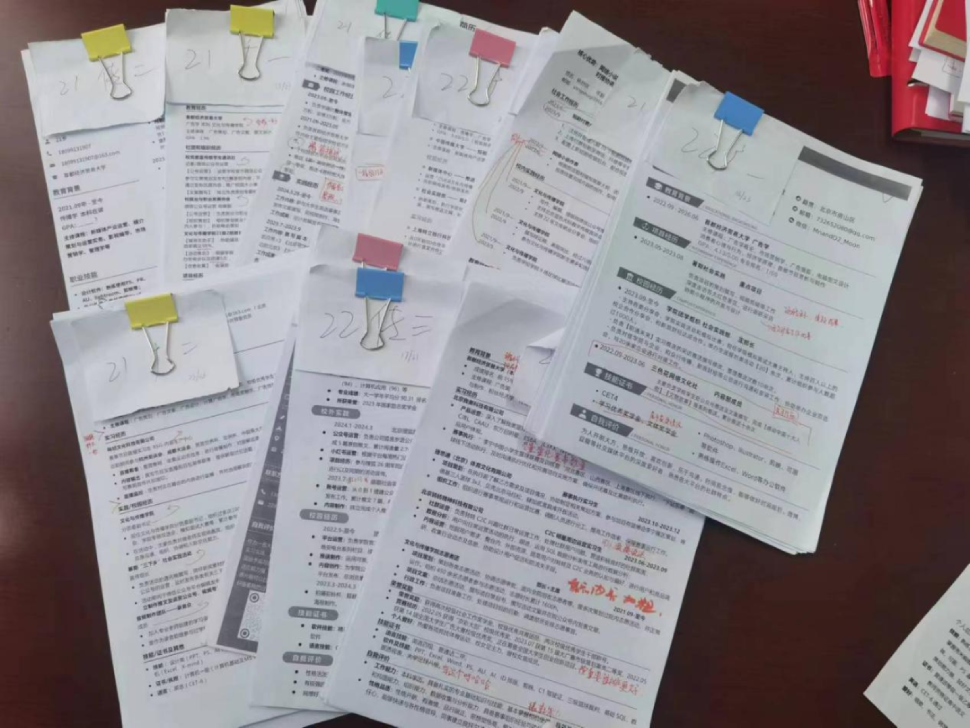 4月20日至5月10日,学院成立指导工作小组,成员们逐份翻阅,为同学们修改、评审简历,用红笔将问题一一圈出,并在一旁仔细批注,帮助同学们优化简历。