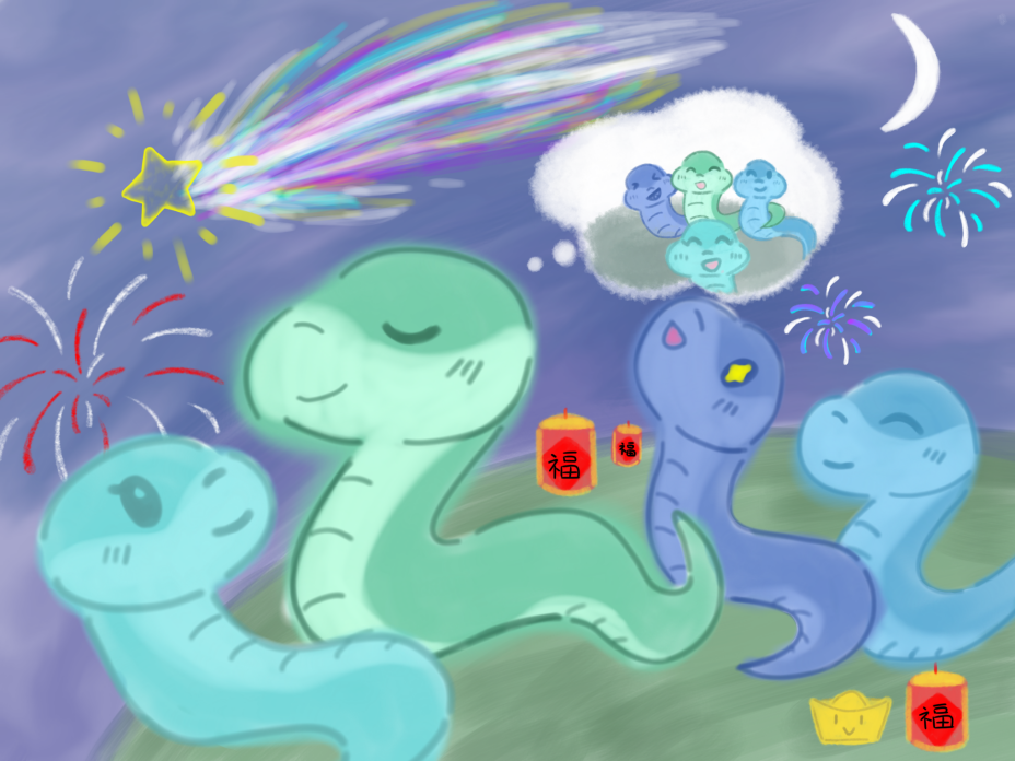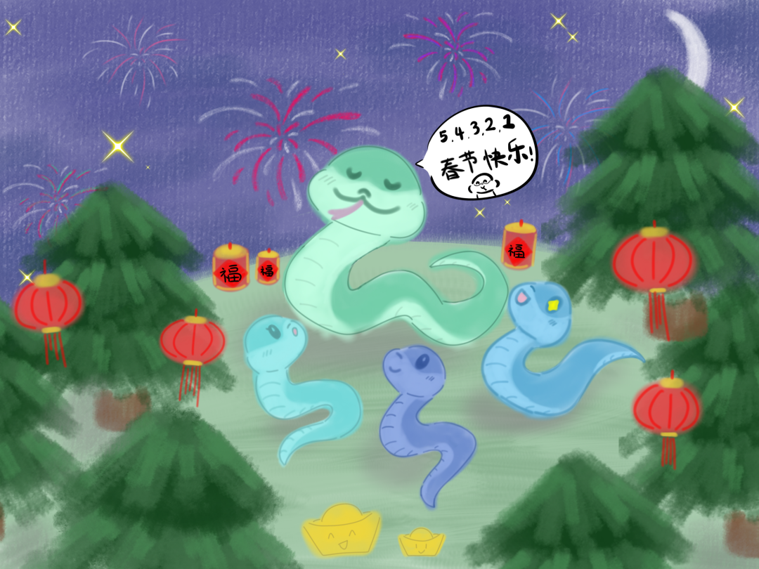 除夕之夜,小青蛇和它的朋友们早早地就聚集在森林中的一片开阔地,准备一起守岁迎接新年的到来。这里远离了城市的喧嚣,却有着一份独特的宁静与祥和。小青蛇作为这群朋友中的“大哥”率先站起身来,它挥动着尾巴,示意大家准备迎接新年的到来。它开始带领着大家倒数:“十、九、八……一,春节快乐!”随着12点钟声的敲响,五光十色的烟花如同绚烂的花朵在夜空中绽放,将漆黑的夜空点缀得五彩斑斓。