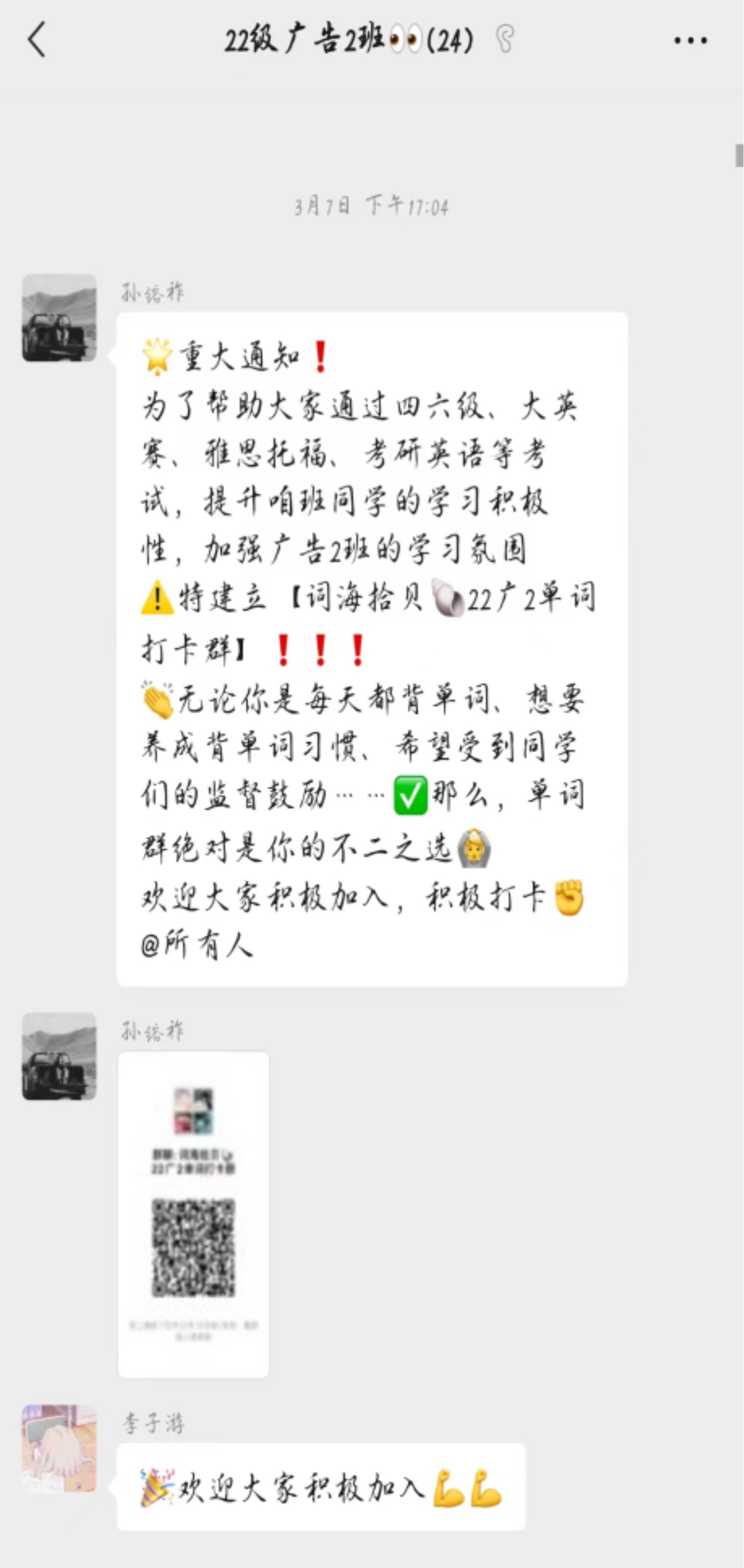 22级广告学2班团支部立足实践,面向未来,为帮助班内同学通过四六级、大英赛、雅思托福等考试,提升同学们对于英语学科的学习积极性,积极建立【单词打卡群】,带领班内同学投入到英语的学习之中。这一举措不仅提高了同学们对英语学习的重视程度,还为大家提供了一个互相交流和学习的平台。