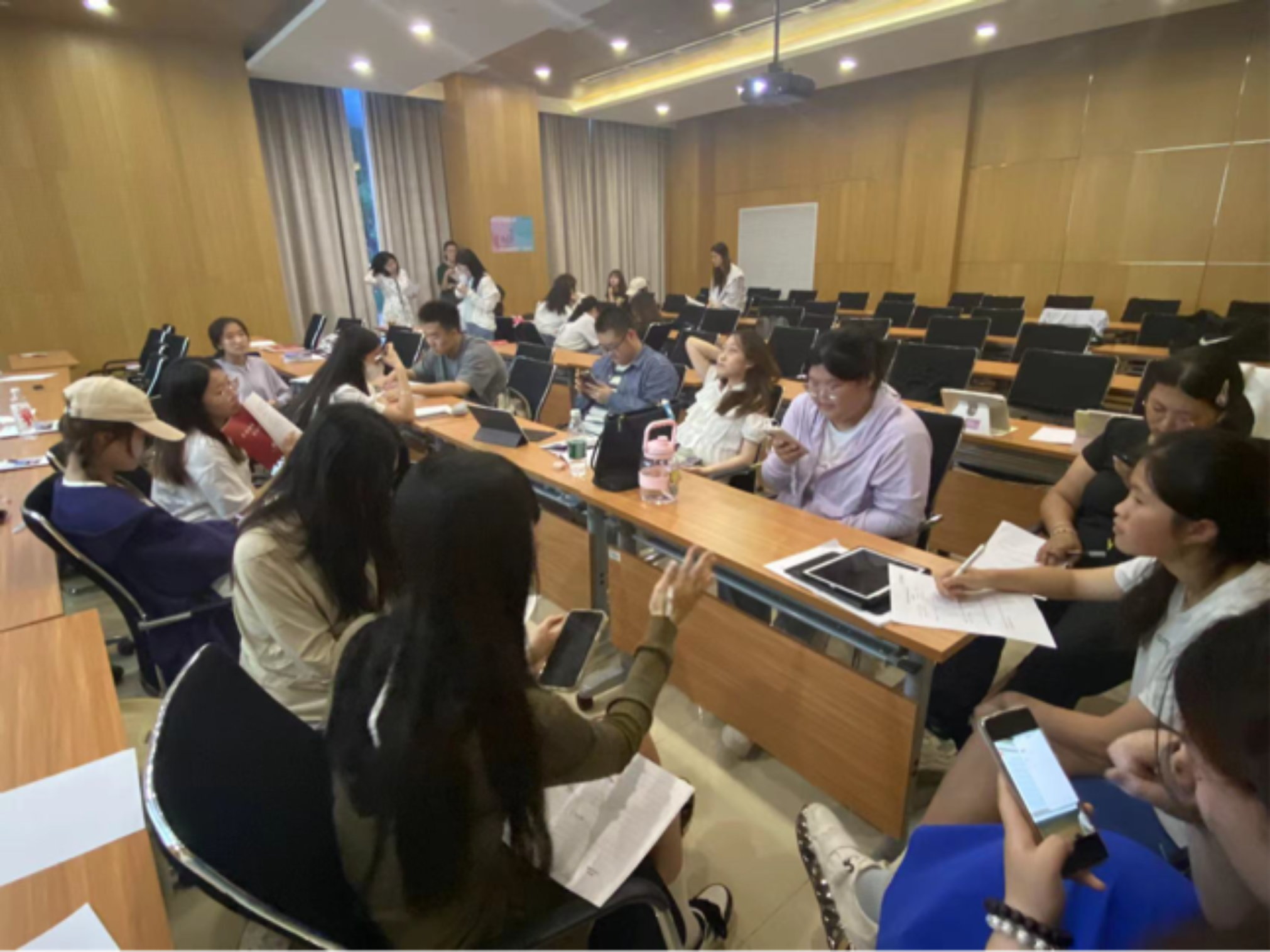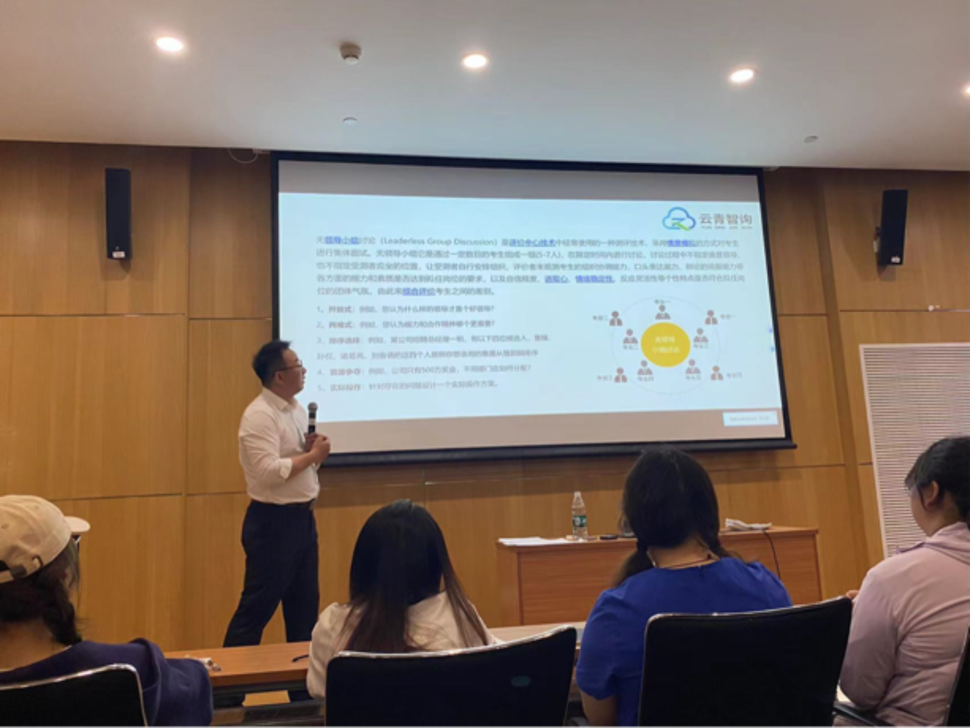 随后,白云带着同学们模拟了一次无领导小组讨论。他让七位同学模拟应聘者,其他所有在座者作为观察者。同学们纷纷积极参与、互动。