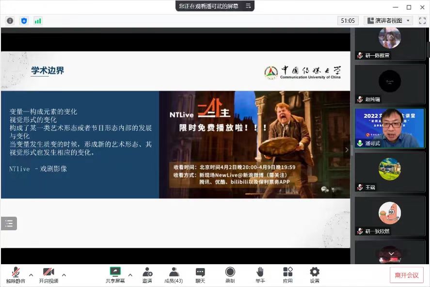 此次活动,上线参加师生近50名。“文传学术大讲堂”是动漫疯 科研、学术系列品牌活动之一。主要邀请学界、业界大家进行专业、行业的学术研究或实践经验分享。鉴于防控疫情的需要,2022文传学术大讲堂在在学期期末线上举办。潘可武教授克服身体不适、工作繁忙等困难,为动漫疯 师生传经送宝,对动漫疯 师生的科研、学科建设等,都是一种莫大的支持和扎实的促进!